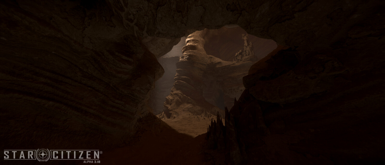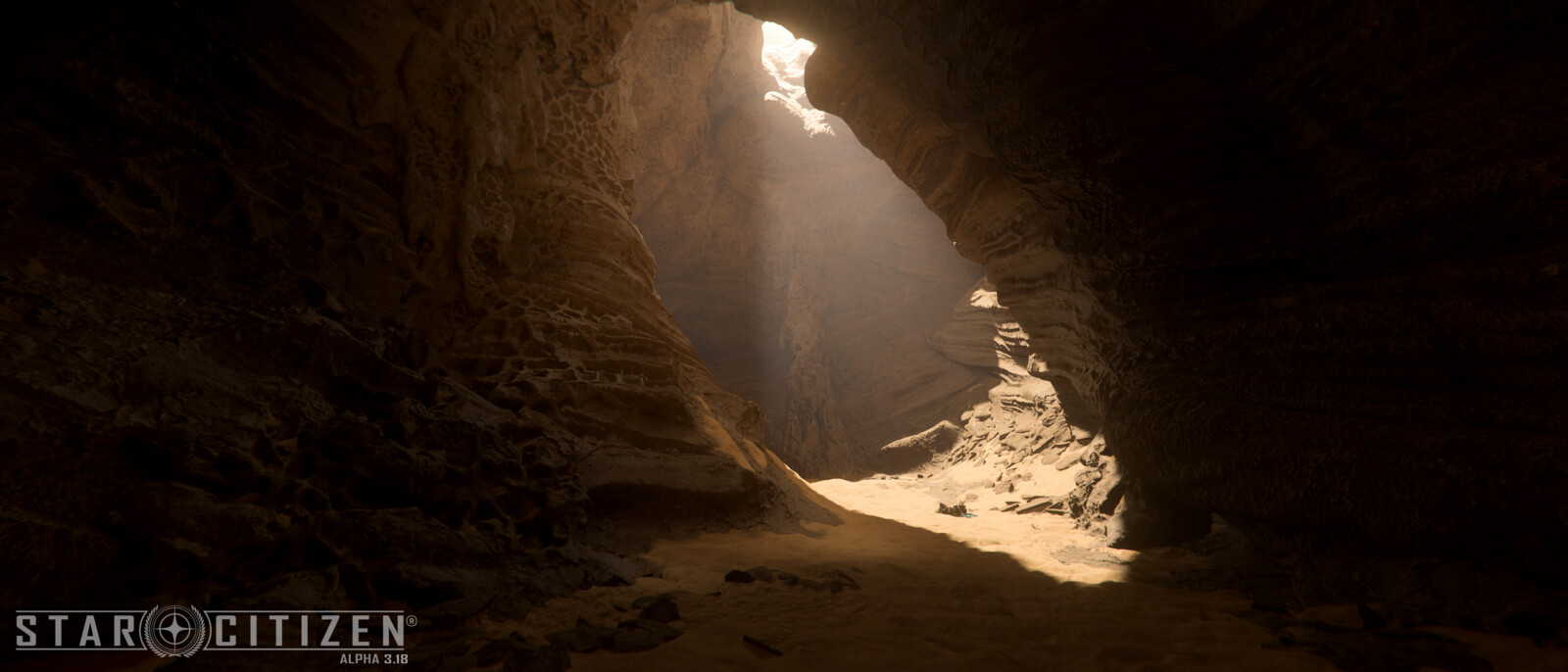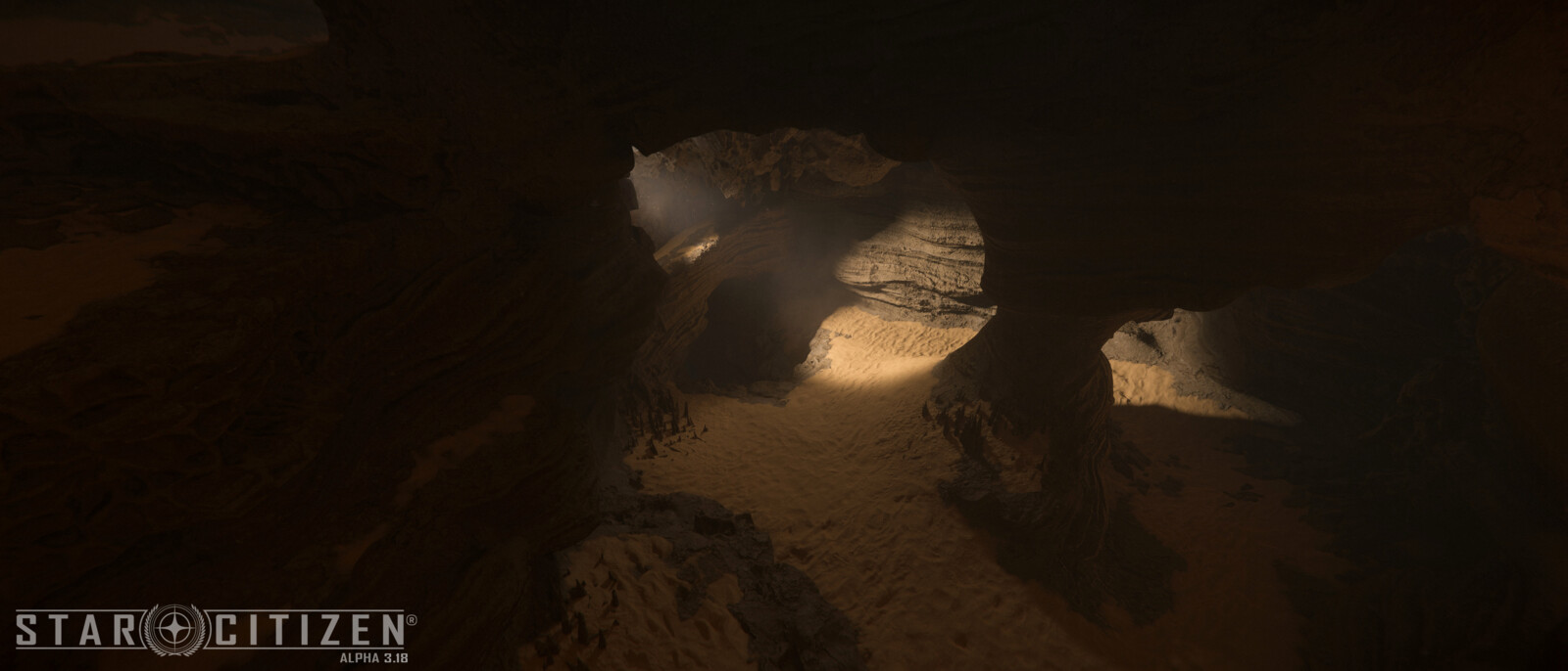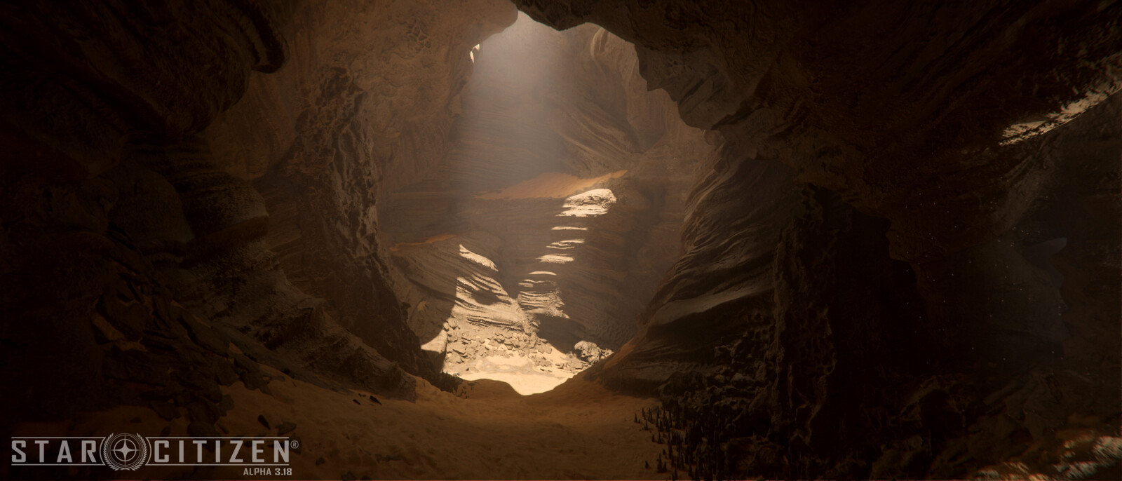 Sand Caves were the first cave archetype I worked on for Star Citizen, introduced in the 3.18 content update. My initial task was to create one of the rooms from whiteboxing and generating cave shells (using our internal cave generator tools), to set dressing, building the cave systems, and placing them on the planets.